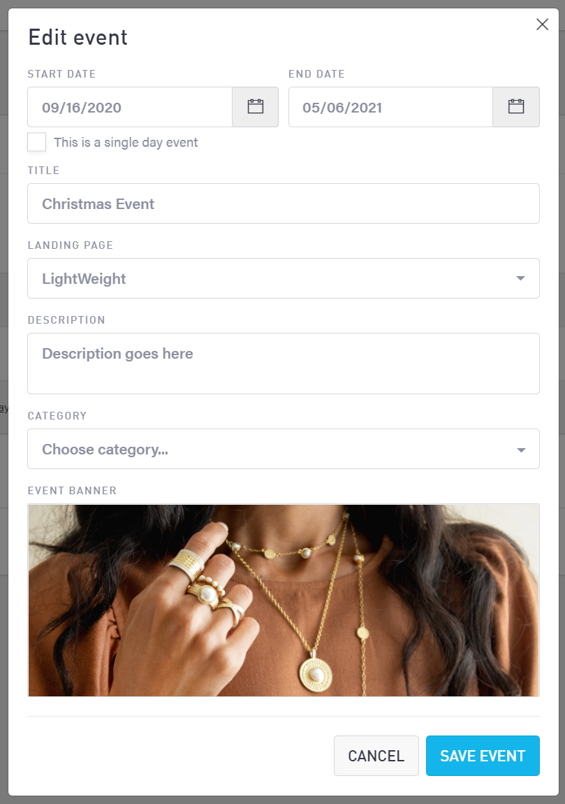 Enter the start and end date using the date selectors. You can also choose to create a single-day event, which will only have a start date.