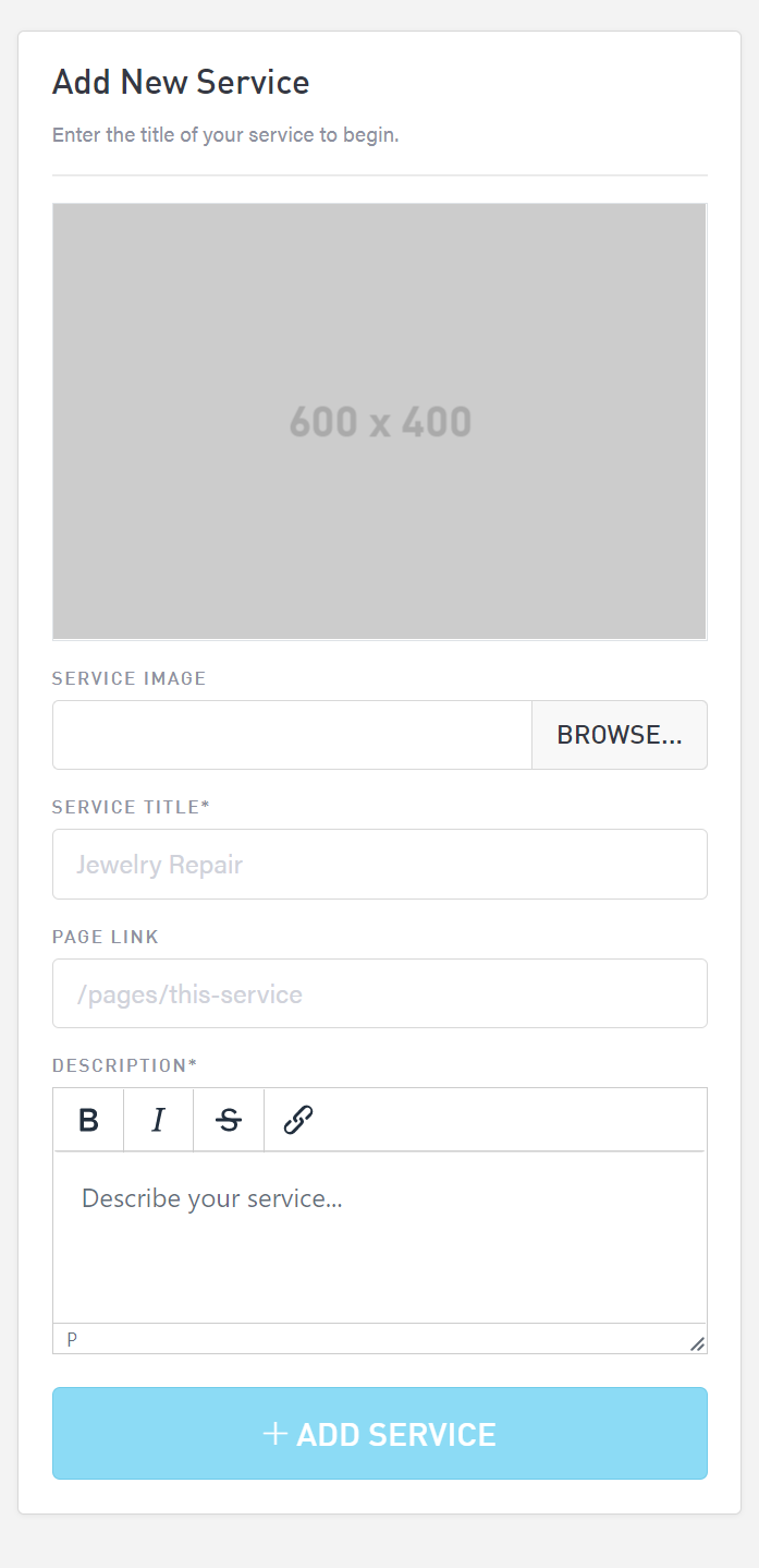 If you do not see a service that you would like to list, the right side block allows you to create a custom service. Select “Browse” to choose an image from FileManager that best represents this service category, then enter in your title, page link (URL extension), and description, and click “Add Service.”
