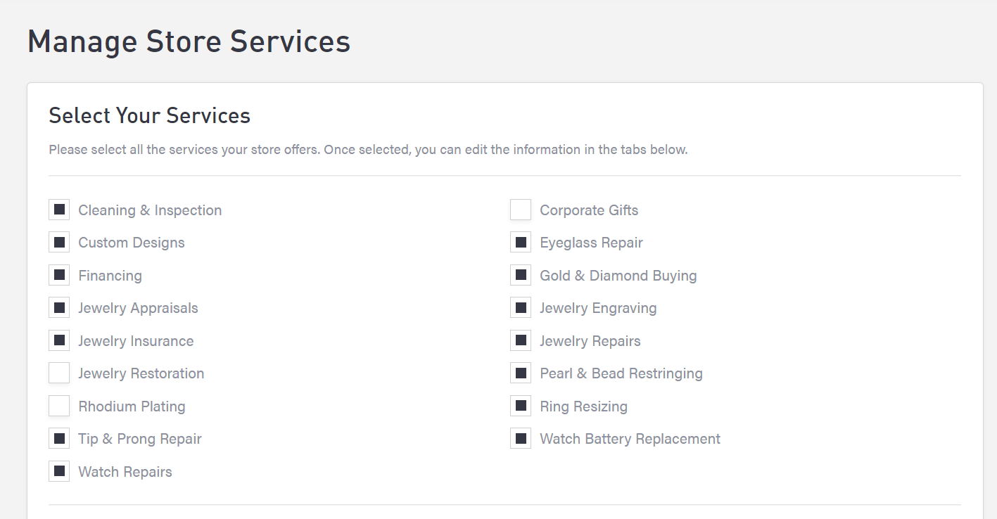 Manage your store services selection using the Store Services section of SiteManager. Your selected store services will auto-generate default pages that you can then customize to suit your store. Watch the educational video that covers the Store Services interface in-depth here.