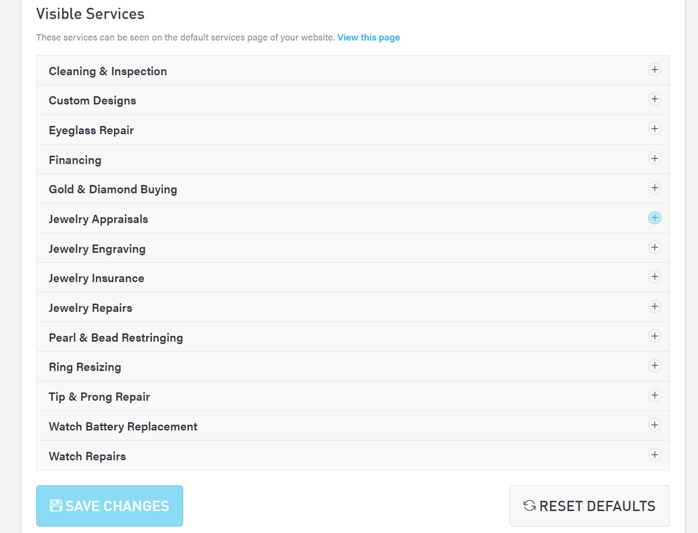 If you decide you would like to restart on your store services, you may select the Reset Defaults button at the bottom of the page. This will reset the page to the auto generated services, and delete any services that may have been added.