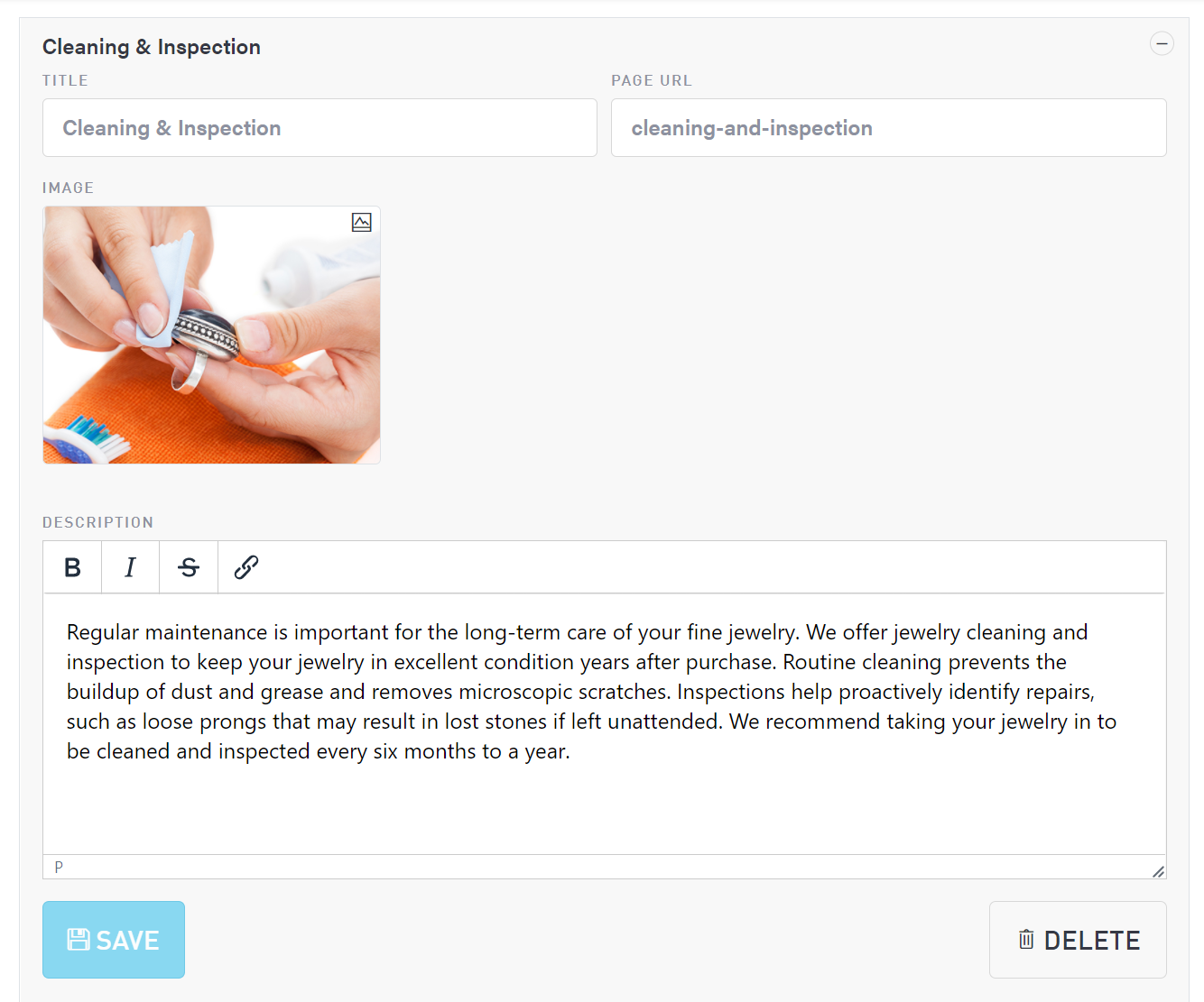 Your page URL will be the extension for the child page. Your main services page is www.mystore.com/services, the page URL you enter here will append after the main services page extension, preceded by a forward slash; in this case, www.mystore.com/services/cleaning-and-inspection.