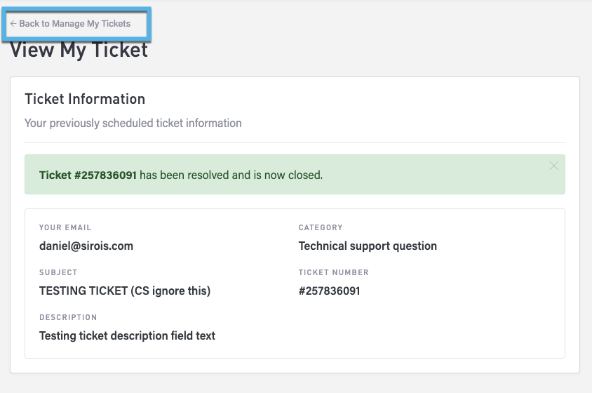 To view a ticket, click the View button to display the detail page. Click the Back to Manage My Tickets link in the upper-left corner to return to the Tickets page.