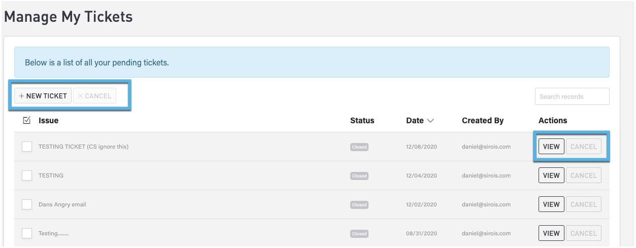 Click Home > Tickets to access the Tickets feature. On this page, you can create new support tickets, view a list of existing tickets, view ticket details, and cancel a pending ticket.