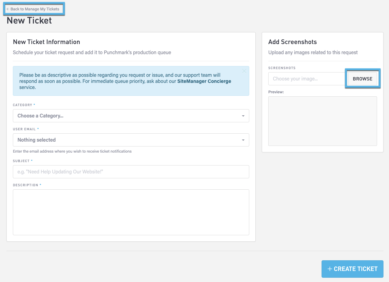 Click the New Ticket button to display the new ticket page. Choose a Category and also a User Email address. Enter a Subject and a Description. If possible, include a screenshot that has been saved as an image file. Click the Browse button to locate the file. Finally, click the Create Ticket button to save the ticket and return to the Tickets page.