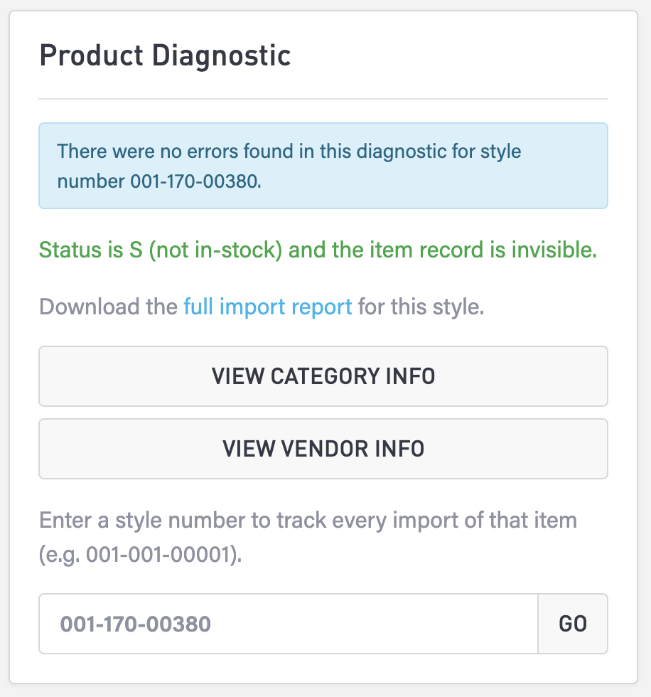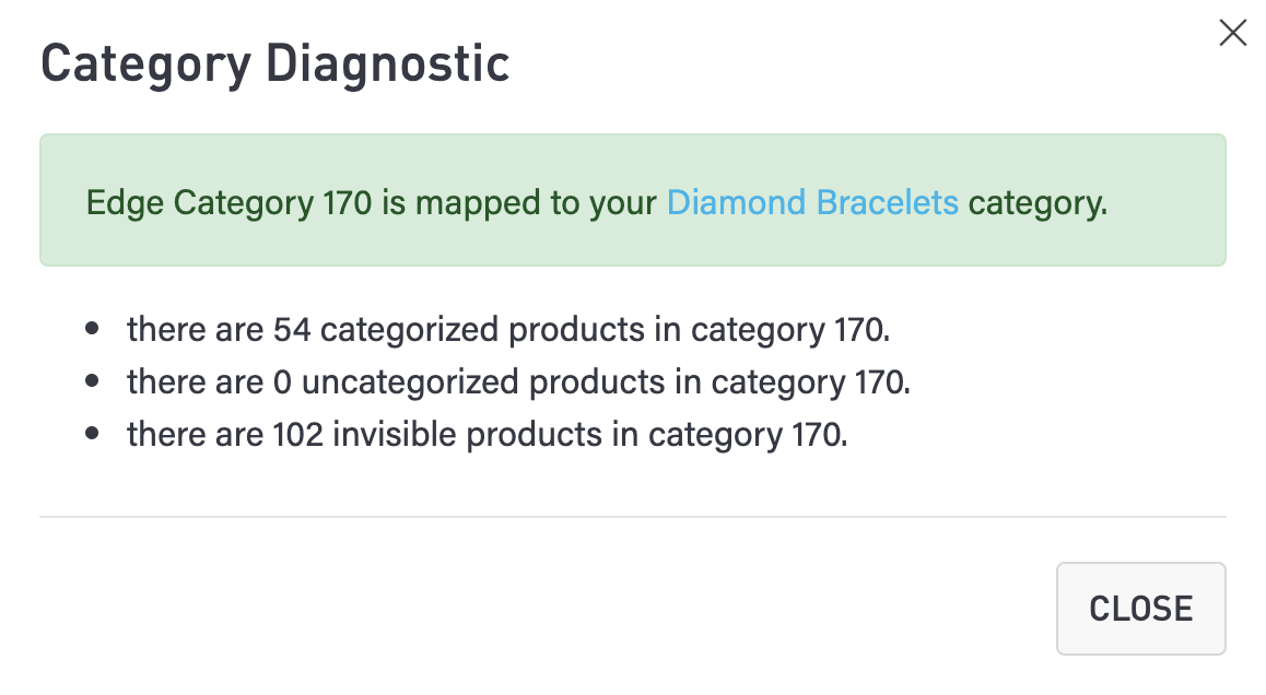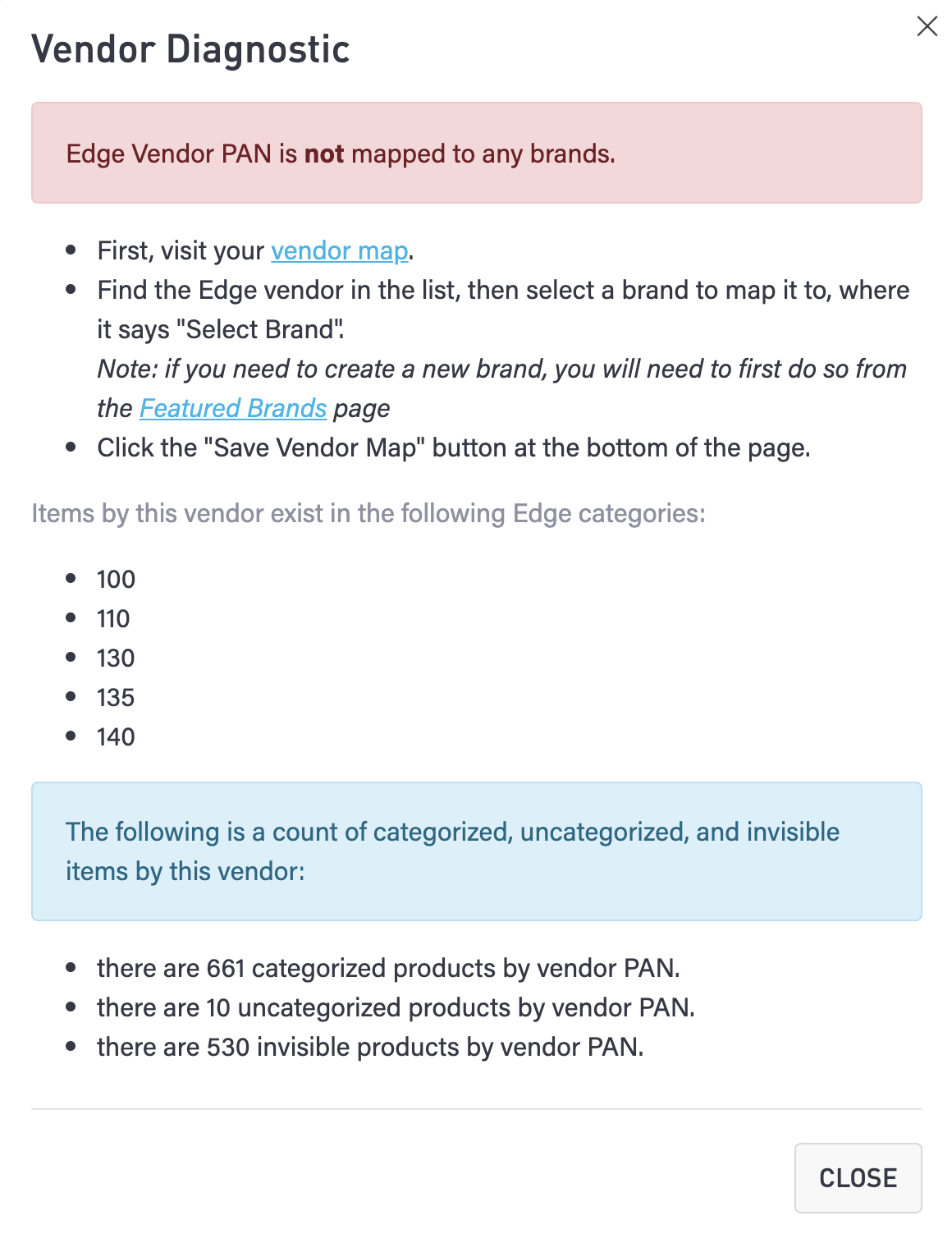 You will also be able to see the category and vendor information associated with the product you are diagnosing. These two tools will tell you if an Edge category is mapped, and if an Edge vendor is mapped. If a category is not mapped (and you haven’t assigned it a category from the Website Tab) then it will not show on the website. However, if a vendor is not mapped to a brand, this does not affect visibility—it just means that the product cannot be browsed by brand.