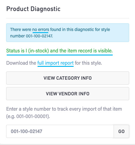 A quick view status message will show and alert you of whether this product is coming to Punchmark as “sold” or “in-stock” and if the item record is “visible” or “not visible”. You will also be provided with a CSV file to download. Click “full import report” to download the CSV and further investigate your product’s data.